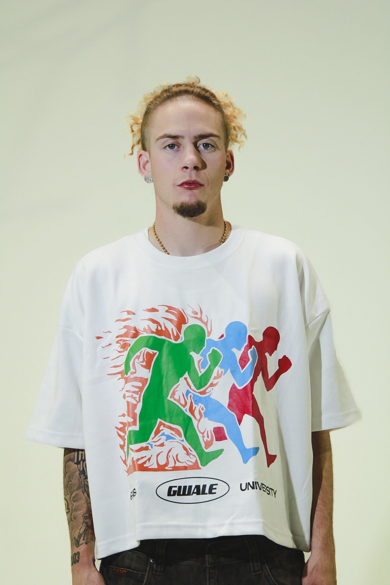 Crafted from 100% heavyweight cotton, this oversized shirt features a running man graphic symbolizing the stages of fulfillment: Visualization, Planning, and Action. The number 89 on the back represents a new beginning—perfect for those embracing their journey with style.