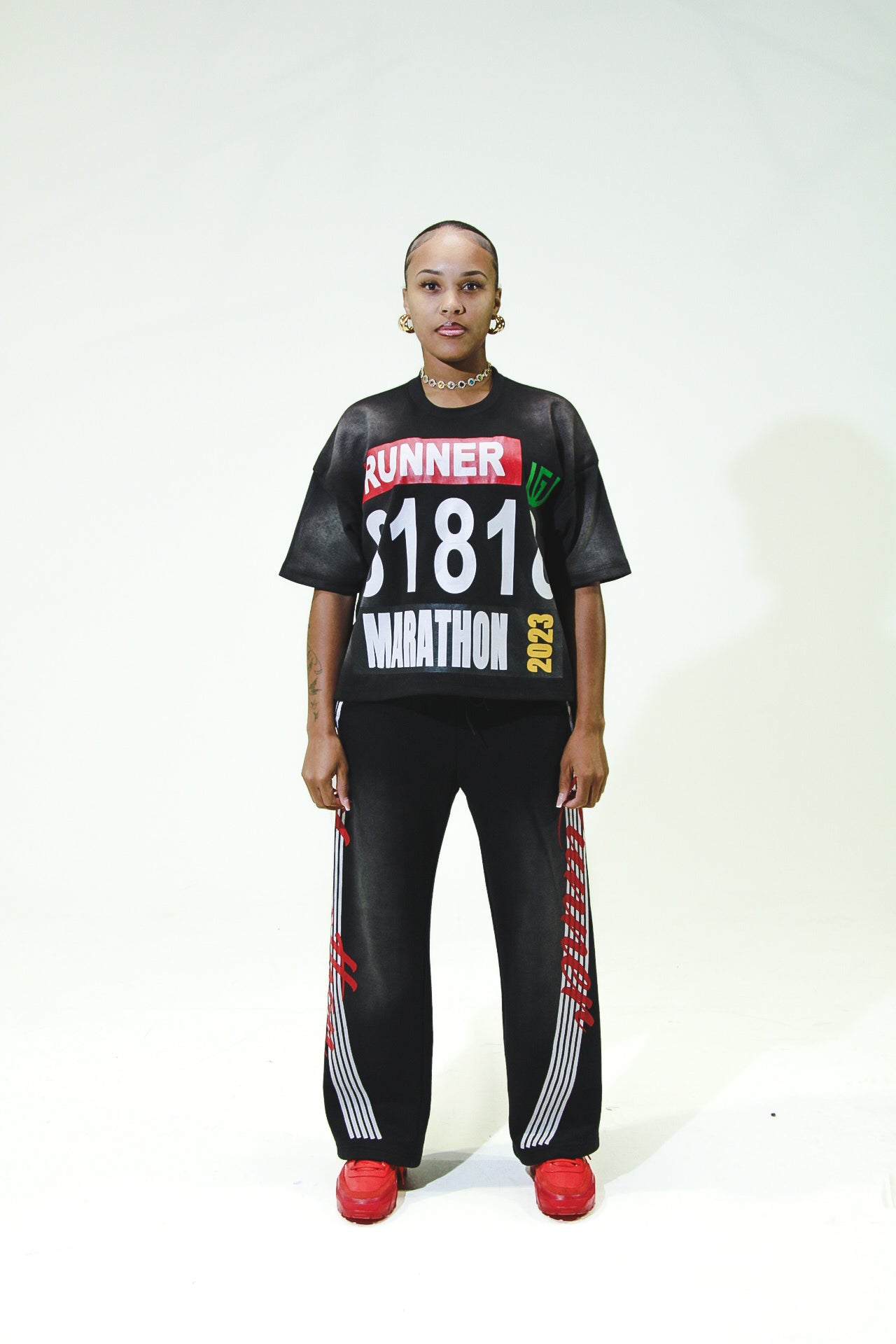The Marathon Runner Pants, made from 100% cotton. It's a reminder to never give up on what you're striving for. The number 818 stands for abundance, prosperity, and a twin flame connection. Run your race. Wear Your Story.